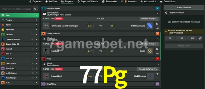 O 77Pg oferece uma grande seleção de opções de apostas em e-sports com probabilidades competitivas
